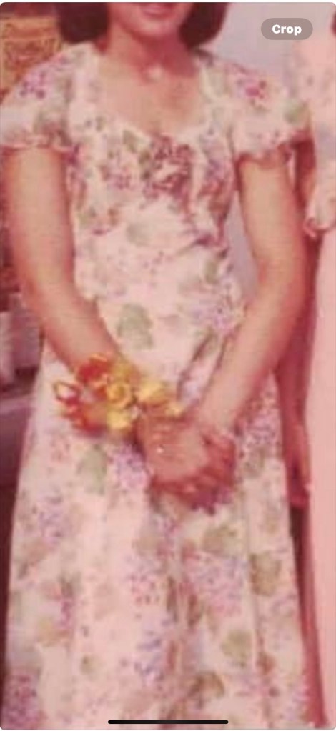 Very 1975 au courant. Check out the groovy, clashing corsage on my wrist. Who picked -that- out?!
