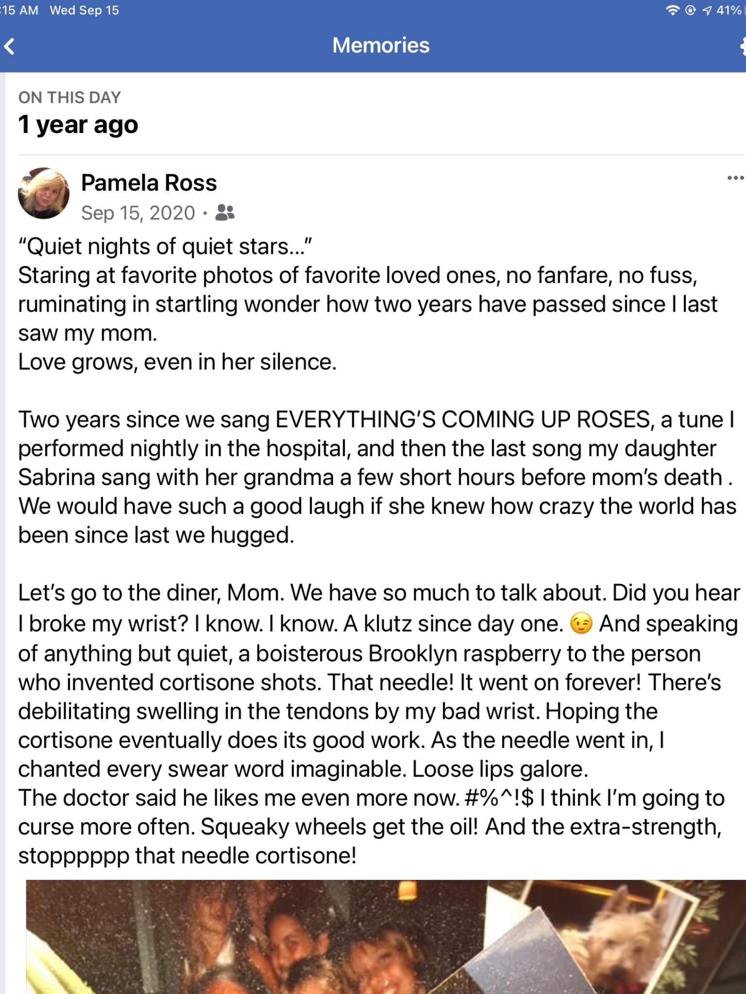 Who doesn’t love a rerun? Posted to Facebook a year ago. Did I write this? Yes. Do I remember this? Not at all. Hold fast to dreams. And memories. And words that boomerang back to you from cyberspace. Welcome home, Astronaut Ross. 👋